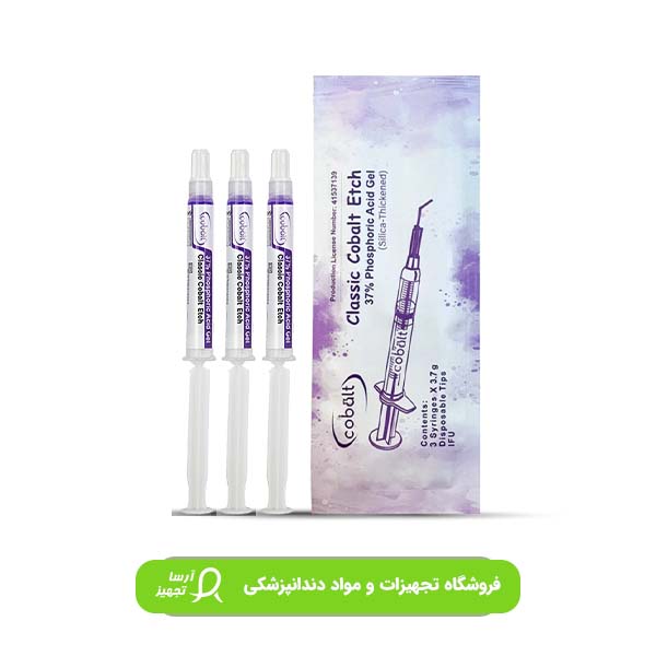 • چنان چه عمل انتخابی اچ در مرز مینا و عاج از اهمییت کمتری برخوردار است و در استفاده های با حجم بالاتر اسید مثل استفاده در درمان ارتودنسی می توانید از اسید اچ سیلیکایی کبالت که با رنگ بنفش به بازار عرضه شده است استفاده کنید. این محصول در سرنگ 3 سی سی با سر سوزن های با گیج 20 عرضه می شود و در ویژگی های عملکردی در اچینگ مینا مشابه محصول اسید اچ پلیمری کبالت می باشد.